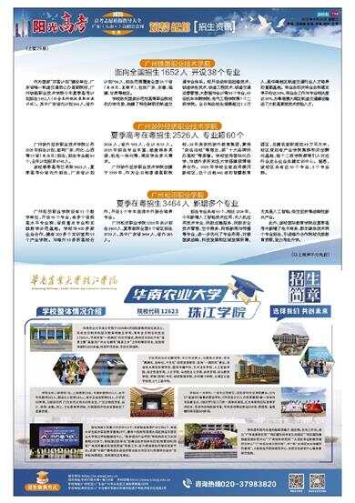 (上接29版) 广州铁路职业技术学院 面向全国招生1652人 开设38个专业 作为国家“双高计划”建设单位、广东省唯一轨道交通类公办高职院校,广州铁路职业技术学院今年夏季高考计划招生1652人(不含本科院校录取回流计划)。其中广东省内计划866人,省外计划786人,招生范围覆盖全国25个省(自治区、直辖市),包括广东、安徽、福建、甘肃等地区。 学校依托国家示范性高等职业院校的办学优势,构建了特色鲜明的轨道交通专业体系。现开设动车组检修技术、铁道供电技术、铁道工程技术、铁道交通运营管理、大数据与会计等38个专业,分设机车车辆学院、电气工程学院等7个二级学院。全日制在校生规模超过1.2万人,是华南地区轨道交通行业人才培养的重要基地。毕业生初次毕业去向落实率平均达98%,毕业生工作与专业相关度达90%,为粤港澳大湾区轨道交通建设输送了大批高素质技术技能人才。 广州涉外经济职业技术学院 夏季高考在粤招生2526人 专业超60个 广州涉外经济职业技术学院公布2025年招生计划,面向广东、河北、山西等15省(自治区)招生,招生专业超60个,全年计划招录6748人。 该校春季高考已录取3629人,夏季高考分省内外招生,广东省计划2526人,省外593人,合计3119人。2025年招生专业丰富,涵盖商务英语、机电一体化等,满足学生多元需求。 广州涉外经济职业技术学院创建于1999年,作为全日制普通高职院校,26年来依托涉外教育集团,秉持“依法治校”等理念,获“十大品牌民办高校”等荣誉。学校坚持国际化办学,与境外多所知名大学搭建硕博培养合作。2025年学校全面启用佛冈新校区,这个占地462亩的智慧教育园区,总建筑面积规划43万平方米,校区规划有产业学院集群和双创孵化基地,每个二级学院都将引入对应行业龙头企业共建实训中心。据悉,该校区共有近50个专业,8个专业群。 广州松田职业学院 夏季在粤招生3464人 新增多个专业 广州松田职业学院设有11个教学单位,开设55个专业,有多个省级高水平专业群、省级重点专业和实践教学示范基地。学校与400多家企业合作,建有200多个实训室和10个产业学院。与海外10多所高校合作,开设8个专本连读中外联合培养专业。 广州松田职业学院2025年共计招生8600人,夏季面向全国9个省区招生3729人,其中广东省3464人,省外265人。 招生专业共有55个,相比2024年,今年新增人工智能技术应用、无人机应用技术专业、民航运输服务、民航安全技术管理、空中乘务、网络新闻与传播等专业,进一步优化了专业布局,对接国家战略、科技发展和区域发展所需,尤其是人工智能、低空经济等战略性新兴产业。 此外,该校国际教育学院在夏季高考中新增了电子商务、数字媒体技术两个专业招生,引进海外合作院校优质教育资源,助力考生升学。 (以上排序不分先后)