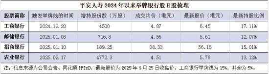 持有工商银行、招商银行H股均超15% 近日,中国平安旗下平安人寿年内第3次举牌招商银行H股。记者梳理发现,平安人寿半年8次举牌银行股H股,成为险资举牌热潮的主力军。分析指出,在资产荒、新会计准则切换的背景下,高股息的银行股备受险资青睐,当前H股银行板块仍然存在溢价压缩空间。 ■新快报记者 林广豪 对四家银行H股持股均超10% 6月24日,平安人寿发布公告称,平安资管受托公司资金投资于招商银行H股股份,近日持股比例达该行H股总股本的15%,触发举牌。同花顺iFinD数据显示,平安人寿6月17日增持招商银行H股629.55万股股份,成交均价为54.19港元,构成上述举牌。 记者梳理发现,去年12月平安人寿举牌工商银行H股,为其时隔5年的再度举牌。今年以来平安人寿共举牌7次,标的还有邮储银行、农业银行的H股,对其持股比例逐步增至10%。 平安人寿增持的步履不停。同花顺iFinD数据显示,平安人寿今年2月12日持有工商银行H股的股份比例为17.11%;6月,其持有邮储银行、农业银行的H股股份比例分别为12.07%和13.12%。 从平安人寿最初增持触发5%举牌线来看,工行、邮储、招商、农行H股的成交均价分别为4.87港元、4.56港元、38.33港元、4.51港元。6月25日,上述四个银行股股价分别为6.45港元、5.61港元、56.15港元、5.78港元,粗略计算,平安人寿的举牌均为浮盈。 坚持长周期趋势投资 记者注意到,在推动中长期资金入市等政策的支持下,近年来险资举牌掀起热潮,今年已达17次,其中涉及举牌银行股就有9次。对于为何青睐银行股,中国平安联席首席执行官郭晓涛在今年5月的股东大会回应称:“平安坚持研判长周期趋势进行投资。应对当前利率下行周期,我们已提前几年对高分红的国有大型银行股进行投资。” 招证银行王先爽团队指出险资偏爱港股大行的原因,包括保险资产荒加剧、港股大行股息率优势显著、保险投资港股有税收优势、港股大行流通市值大等。 财经评论员郭施亮指出,经历了两年左右的单边上涨行情,国有大行以及头部股份行的估值与股息率已经发生了显著变化,投资性价比也明显低于前两年。但是,与股票市场大部分的公司相比,优质银行股依然具备一定的估值优势和股息率优势。 值得注意的是,在南向资金和险资增配的影响下,近期银行股H股表现强劲,6月25日中证香港银行投资指数涨1.08%,当月涨幅为10.52%。有分析认为,当前海外地缘冲突扰动、内部流动性收紧的压力在上升,H股银行板块仍然存在溢价压缩空间。