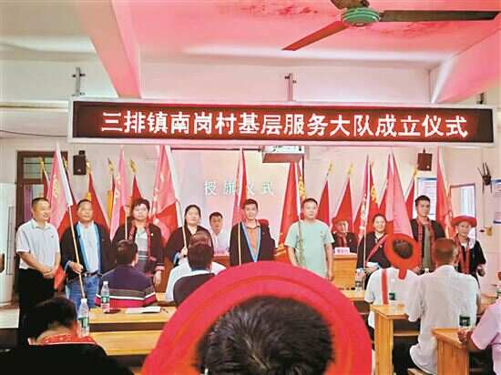 新快报讯 记者方轶 通讯员陆景报道 6月29日,清远市连南瑶族自治县三排镇南岗村基层服务大队正式成立。三排镇领导、南岗村“两委”干部、党员群众代表及服务大队全体成员共同见证了这一时刻。 南岗村第一书记陆景围绕工作目标、服务内容、运行机制等方面,对基层服务大队工作方案进行深入解读,系统阐述了服务大队“扎根基层、服务群众”的工作规划;南岗村党总支部书记唐春明宣读《关于成立三排镇南岗村基层服务大队的决定》,标志着这支承载乡村振兴使命的队伍正式组建。三排镇党委副书记盘东旭为南岗村基层服务大队授旗,大队长唐春明郑重接旗。 “基层是大有可为的广阔天地!”盘东旭表示,基层服务大队的成立是贯彻落实党的二十大精神、深化乡村振兴战略的生动实践。他强调,服务大队要以“接地气”的方式做好政策宣讲,用“实招硬招”推动特色产业发展,以“暖心服务”化解基层矛盾。全体队员要强化责任意识、提升服务本领、严守纪律规矩,真正成为群众信赖的“贴心人”。镇党委、政府将全力提供资源保障,支持服务大队在基层治理中发挥更大作用。 南岗村基层服务大队的成立,构建起了“党建引领、多方参与、全域覆盖”的基层服务体系,将为建设宜居宜业和美乡村注入强劲动能。