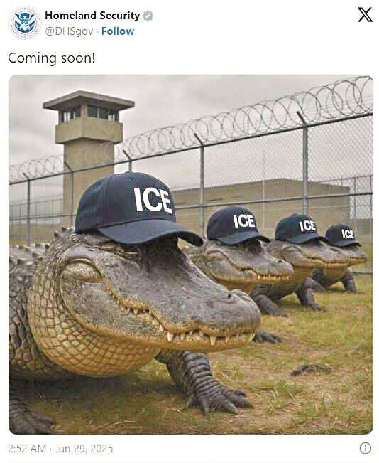 ■美国国土安全部在其社媒账号上发布了一张AI生成图,画面是一处监狱外一群戴着“ICE”(美国移民及海关执法局)字样帽子的鳄鱼,并配文称“即将到来!” |
