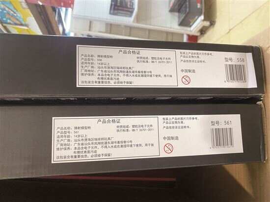 ▲部分水弹枪上的产品合格证,并未标注3C标识。 |