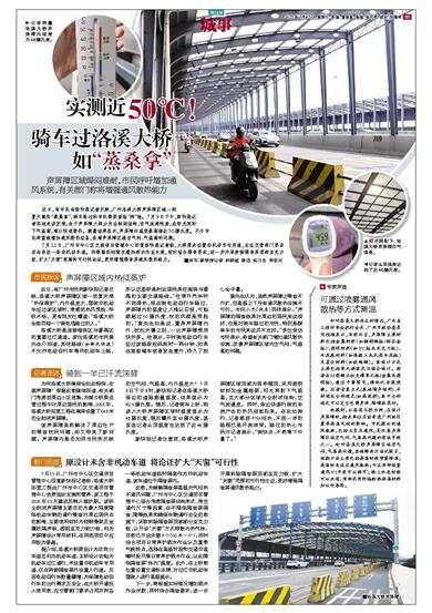 声屏障区域焗闷难耐,市民呼吁增加通风系统,有关部门称将增强通风散热能力 近日,有市民向新快报记者反映,广州洛溪大桥声屏障区域一到夏天就似“蒸桑拿”,骑车路过的市民都要面临“烤”验。7月9日