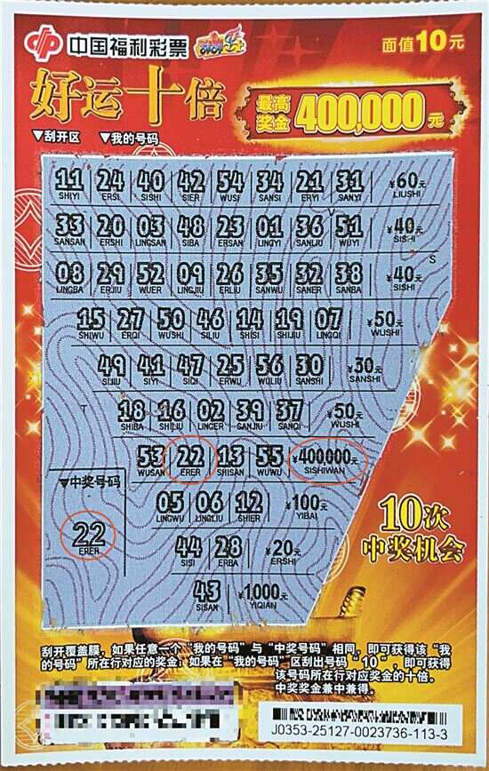 新快报讯 记者陆妍思 通讯员黄丽娜 黄英杰报道 中山市横栏镇富庆一路17号的44110329福彩销售站点传出喜讯,一位彩民购买了“好运十倍”刮刮乐即开票(面值10元),幸运刮出一等奖40万元。据统计,这是中山市今年中出的第9个“刮刮乐”一等奖。 近日,大奖得主张先生(化姓)来到中山市福利彩票发行中心办理兑奖手续。据张先生介绍,当天晚饭后,他外出散步路过44110329福彩销售站点,抱着娱乐消遣的态度进站买了“刮刮乐”。“我抱着乐观的心态购彩,中奖固然好,不中就当做公益。”张先生开心地分享道,此前他曾中过几次小奖,第一次刮出一等奖,非常兴奋! 福彩众多游戏中,刮刮乐即开票凭借其即刮即兑、玩法多样、趣味性强等特点,受到不少购彩者的喜欢。其中“好运十倍”刮刮乐即开票,是经典的对数字玩法,任意一个“我的号码”与“中奖号码”相同,即可获得该“我的号码”所在行对应的奖金;如果在“我的号码”区刮出号码“10”,即可获得该号码所在行对应奖金的十倍。中奖奖金兼中兼得。玩法简单、通俗易懂、趣味性强。 公益同心,与善同行。1987年6月3日,中国社会福利有奖募捐委员会正式成立,确定了“团结各界热心社会福利事业的人士,发扬社会主义人道主义精神,筹集社会福利资金兴办残疾人、老年人、孤儿等福利事业和帮助有困难的人”的初心使命,并在实践中逐渐归纳形成福利彩票“扶老、助残、救孤、济困”的发行宗旨,明确了福利彩票的公益属性和发展方向。1987年7月,中国第一张福利彩票(时称“中国社会福利有奖募捐券”)在河北省石家庄市上市。 每一张福利彩票,承载着购彩者的爱心,肩负公益使命。中国福利彩票发行销售所募集的福彩公益金全部上缴财政,主要用于补充全国社会保障基金、支持教育助教助学、发展残疾人事业、困难群体大病救助、补助城乡医疗救助基金以及扶贫等社会公益事业;重点用于老年人、残疾人、孤儿、留守儿童、困难群众等社会福利事业,持续为社会福利和公益事业的发展贡献力量。