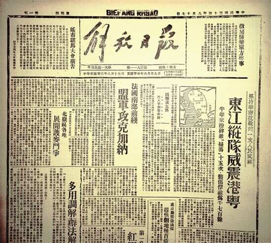 ■1944年8月17日《解放日报》报道《东江纵队威震港粤》。 |