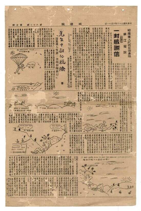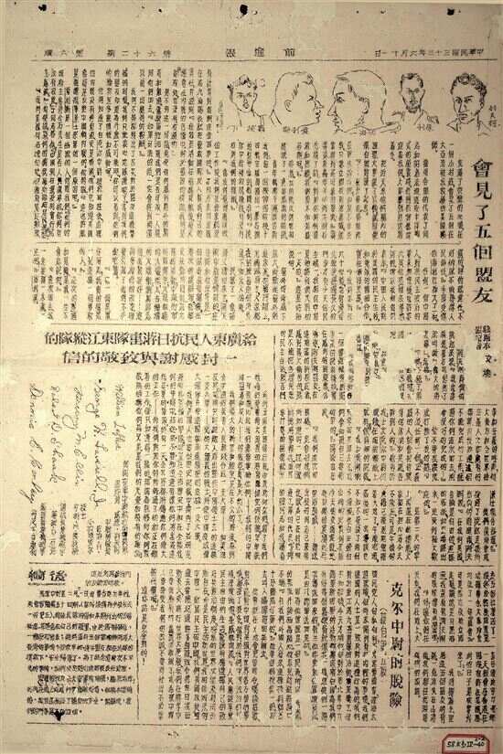 ■1944年6月11日《前进报》上刊载的两篇报道,《获救的五名美军飞行员给广东人民抗日游击队东江纵队的一封感谢与致敬的信》及《会见了五个盟友》。 |