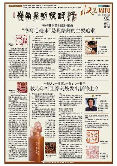 日前,西泠印社社藏金石书画精品展在广州展出引起有关岭南篆刻话题,在广东,作为当代著名篆刻家,钟国康以其独特的“书写毛毫味”艺术追求在岭南篆刻界独树一帜。他的篆刻之路始于少年时代,受篆刻大家黄文宽先生“刀刀准要深刻”的影响,这一理念更成为他日后创作的核心。钟国康强调篆刻不应局限于汉印的工整规范,而应凸显刀味、石味与书写味的融合,反对千人一面的模仿。他直言不讳地批评那些死守汉印传统却缺乏创见的篆刻家,认为真正的艺术需要个性与风骨。 “刀刀准要深刻” 收藏周刊:您在篆刻上的探索,从什么时候开始的? 钟国康:我在十来岁的时候有机会跟黄文宽接触,他还专门给我刻了一个“钟”字,还记得当时他直接用毛笔在印石上写,然后直接刻,刀刀准,刀刀深,这给我印象很深刻,因此,“刀刀准要深刻”,这样一刻,书写毛毫味,就自动跑了出来。一直贯穿着我后来的篆刻探索。 收藏周刊:您认为“刀刀准要深刻”的好处在哪里? 钟国康:刀准深刻,笔画与笔画之间的崩裂,就形成了毛毫涨墨效果,自然就能凸显书写味,书写味是我篆刻的主题,跟历史和任何人拉开距离的手段。 只解析汉印特质,不教模仿 收藏周刊:黄文宽是否受汉印影响比较大? 钟国康:他是在汉印的基础上有了自己的突破,加强了刀味、石味、书写味,这都是汉印没有的。汉印倾向工整整齐,用刀刻没有刀味,用石刻没有石头崩崩裂裂的质感,明明是用篆书入印的却没有书写毛毫味,明明是用墨起稿的却没有墨味,这就是汉印的硬伤。西泠印社的社员大部分都是学汉印,而反对刀味、石味,以干净布白整齐为追求。我最反感那些死学汉印却毫无创见的人,而且机器可以代替汉印,比汉印分朱布白更整齐。他们的作品千人一面,却总拿汉印当标尺攻击异己。 我的课堂只解析汉印特质,不教模仿。某些“大师”,他们所刻的白文印跟朱文印好像是两种风格,朱文印和白文印不能协调成为一个人的风格,几乎都是假大空的大师。这些所谓“大师”,收费昂贵却刻得跟机雕无异,成品连几块钱的机刻印章都不如,把汉印元朱文刻得千人一面还敢自称大师?可笑。 收藏周刊:您个人在篆刻上的风格追求如何? 钟国康:我是取百家之长,在学习吴昌硕、齐白石等大家的基础上,再融入现代精神、写意和傅山的“四宁四毋”思想。 收藏周刊:您认为怎样才算是一件好的篆刻作品? 钟国康:首先要有刀味、石味、书写味、涨墨味(笔画之间深刻,自然崩裂,就成了涨墨味),既然篆书入印,就要有书写味,最后融入个人情怀。真正的篆刻要有刀劈斧凿痕、石纹崩裂之迹、笔意流淌、墨韵渗透......这些才是个人风格的印记。书法尚且有五体八变,艺术更该百家争鸣。 ■收藏周刊记者 梁志钦 实习生 张芃昕