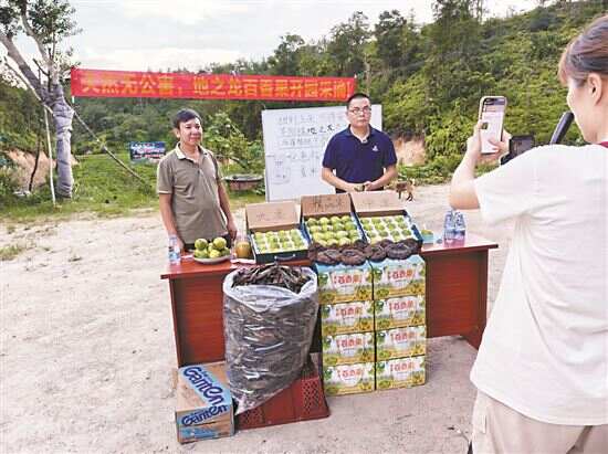 ■梁锦泉(左二)助农直播带货,带动本地种植黄金百香果“出山融湾”。 |
