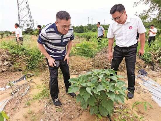 ■刘松(右)陪同后方单位领导查看南药种植基地洋金花的长势。 |