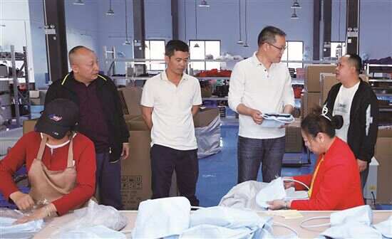 ■谢加明(左三)走访参观惠娅皮具生产车间。 |