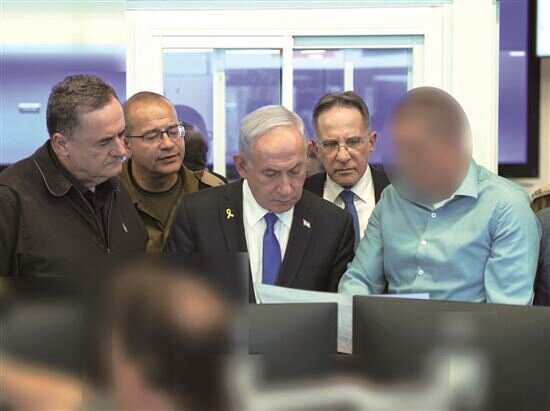 ■9月9日,以色列总理内塔尼亚胡(中)、以色列国防部长卡茨(左一)等在一处辛贝特指挥中心内交流。 新华社发 |