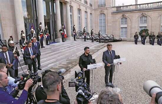 ■9月3日,在法国巴黎总统府爱丽舍宫,法国总统马克龙(中右)与来访的乌克兰总统泽连斯基(中左)共同会见记者。 新华社发 |