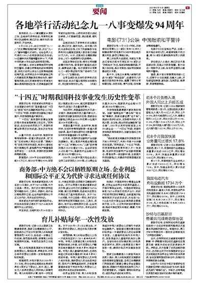 新快报讯 九一八事变爆发94周年之际,各地举行多种活动,传承和弘扬伟大抗战精神,铭记历史、缅怀先烈、珍爱和平、开创未来。 9月18日上午,在辽宁沈阳“九·一八”历史博物馆残历碑广场,勿忘“