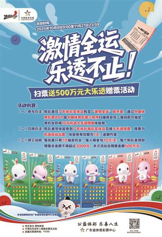 激情全运 乐透不止 想用一种全新的方式为即将到来的十五运会加油助威吗?现在,机会来了。即日起至11月21日,广东省体育彩票中心重磅推出“激情全运 乐透不止”扫票送500万元大乐透赠票活动,进一步回馈广大购彩者,为全民喜迎十五运会增添氛围。 ■新快报记者 陆妍思 通讯员 粤体彩 十五运会将于11月9日至21日在粤港澳三地举行。为迎接十五运会,营造“全民迎全运、全民促共建”的良好氛围,充分发挥体育彩票在体育宣传和公益传播中的独特作用,广东体彩中心于今年6月21日上市了“激情全运”主题即开型体育彩票。 这款游戏以十五运会吉祥物“喜洋洋”“乐融融”为核心视觉元素,巧妙融入赛事会徽和“激情全运会 活力大湾区”主题口号。刮奖区则精选了十五运会的相关比赛项目图标,包括乒乓球、篮球、帆船、击剑、田径、举重等。 整体票面风格清新、淡雅、活泼,生动展现了十五运会的青春活力与体育精神。“激情全运”主题即开票的上市,赢得了社会公众和购彩者的青睐,持续掀起一阵阵参与刮彩、关注全运的小高潮。 本次广东体彩中心开展的“激情全运 乐透不止”扫票送500万元大乐透赠票活动,活动长达44天,覆盖了十五运会的开闭幕式时段,为广大购彩者提供了充足的娱乐体验时间。 本次活动是广东体彩中心借助十五运会在粤港澳大湾区举办的东风,将体育彩票的公益品牌与全民健身、竞技体育紧密相连,进一步彰显国家公益彩票的责任与担当的重要实践,也是广东体彩创新产品协同发展、优化购彩者体验、落实“三全发展思维”的一次重要举措。 为让购彩者轻松参与活动,本次活动设置了简洁明了的参与办法与兑换规则。 活动期间,购彩者在广东省体育彩票实体店购买“激情全运”即开票,通过中国体育彩票APP或中国体育彩票小程序扫描保安区二维码即可参与活动,有机会抽取10元机选大乐透赠票体验券,总赠票金额500万元。每个购彩者领取赠票总金额不得超过3000元。 那体验券如何兑换大乐透彩票呢?也很简单:购彩者凭体验券到广东体育彩票电彩实体店兑换大乐透赠票,赠票为机选自动出票。需要注意的是,体验券有效期为7天,逾期作废。
