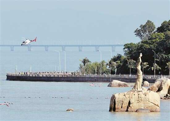 ■选手从珠海渔女前骑行经过。 |