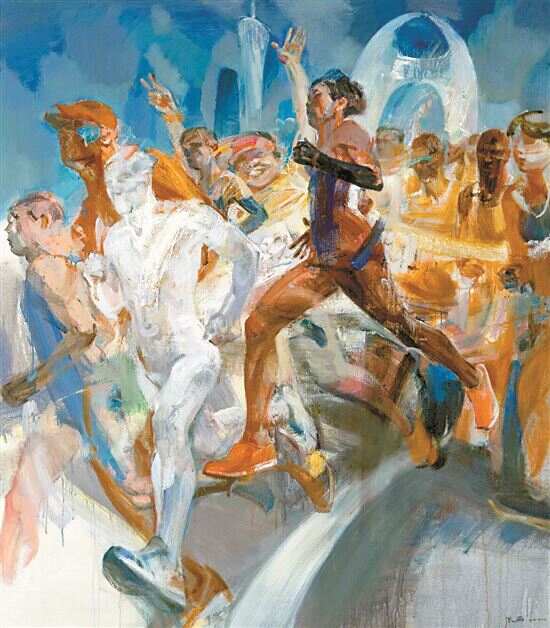 孙戈作品《都市小精灵》刊入2012年教育部审定的《美术》(二年级下册),同年,作品《铨铨的假日》也入选了《创意城市·2012伦敦美术大展暨2012(伦敦)奥林匹克美术大会作品集》。“我本来就是‘运动员’出身的。所以,一直以来对运动题材都特别有感觉。”谈起跟体育的渊源,广州市美协速写艺术研究中心主任孙戈还特别回忆了小时候作为运动员参加训练的经历。 冰球训练的经历受益终身 小学五、六年级,孙戈的身体素质虽并不算突出,但却作为哈尔滨少年业余体校冰球队的一员,有过一段参加学校冰球队的训练经历。“虽然基本算是没上过场的‘板凳队员’,但那么一段的冰球训练的经历,让我受益终身。” 孙戈回忆,当年冰球队的耐力训练、灵敏度训练、技战术训练及高强度体能训练,依然历历在目。“夏季的陆地训练,艰苦而枯燥,八区体育场的看台,每次都要上下几十个来回,弯腰在太阳底下练习基本滑冰动作是每次训练的必修课,射门、运球技术训练就算是有点意思的项目了。到了入冬,天天都盼着结冰,每天都要去冰场感受冰层的厚度,盼着早日冰上训练。那时候,我一直最羡慕老队员,感觉他们把红色球衣剪开领口加上拉链变成大翻领有如最帅的时装,用球杆架上冰球鞋走在街上十分威风。一个小学生每个月还能补助几斤粮票,在当年可是不得了的事。” 广东对体育运动的重视是有目共睹的 回想起训练的那段日子,除了特别艰苦,还偶然伴随着危险。“我的左眼上眼皮现在还留着个疤。这也成了我运动员生涯的战绩。”原来,孙戈在当年的一次训练中,争抢时被队友冰球杆子挑的,当场流血,“我以为眼睛瞎了,一直捂着回家,慢慢打开才发现只伤到了眼皮,真的好悬。” 虽然训练有过危险,但孙戈并没有因此对运动产生芥蒂,相反,后面尽管没走上职业运动员的道路,但他选择了用画笔表达运动员的英姿。 谈及广东作为第十五届全国运动会的主要举办地时,孙戈表示,“一直以来,广东对体育运动的重视是有目共睹的,无论是走出国门的体育佳绩还是全民健身的群众体育。而且这里有气候优势,一年四季都适合运动。北方一到冬天,下雪之后,出门都不方便。”他还说,“期盼全运会开幕之后,我们也有计划,看看能否有条件组织画家,走到场馆里,画一些比赛项目,发挥出速写就是美术轻骑兵的独特优势。” ●广州画院专职画家 张西: 《奔腾·广州步伐》主要表达的是广州马拉松国际比赛的一刻,彰显新时代特色和广州精神。 广州马拉松赛于2012年创办,作为广州市的一项品牌赛事和一张城市体育名片面向全世界传播城市形象、城市文化、城市价值。参赛者除了国际专业运动员,更多的是业余跑友、土生土长的老广。比赛当天,就会出现“万人奔腾”的盛况,几万名跑者在广州“一江两岸”的城市赛道上奔跑,景观浩大壮丽。此张创作想体现广马跑者奔跑的节奏契合着城市发展脉搏,全民的体育盛会彰显着新时代城市的精神气质。 ●广州画院专职画家郭楚开: 作品《千钧势》以极具稳定感的对称三角形构图统摄画面,塑造了一位造型夸张、凝神聚气的举重运动员形象。艺术家采用大写意手法,以简练而富有张力的线条概括出雄浑的体魄与饱满的肌肉形态。人物呈蹲姿,双腿分立,双臂蓄力,于静态中蕴含迸发之势,生动捕捉了发力前千钧一瞬的戏剧性张力。 笔墨语言上,通过浓淡干湿的丰富墨色与强烈的黑白对比,突出主体的体量感与力量感。背景大量留白,并以凝重的墨块点缀呼应,既净化了空间,使视觉焦点集中于人物神态与动势,亦在虚实相生中拓展了画面的意境空间。作品超越了简单的形体描摹,通过形式构成与笔墨意趣的巧妙结合,将“势”这一中国传统美学概念视觉化,展现出一种含蓄而磅礴的生命力。 记者手记 艺术让体育充满了诗意 举办运动会,讨论艺术里的运动题材并非赶时髦,皆因这是历史自古有之。甚至说,体育与美术同样作为人类文明中两种截然不同的表达形式,本质上是息息相关的,常常有着千丝万缕的交织关系。 在中国古代,体育活动的身影早已融入艺术创作之中。汉代的“铜蹴鞠图案印”以简洁的线条,定格了两人“颠球”对抗的瞬间,成为我国古代足球运动的珍贵物证。唐代章怀太子墓中的《马球图》,更是以磅礴的气势描绘了二十余名骑手挥杆击球的壮观场面,被誉为中国马球运动最早的形象记录。这些作品不仅是当时社会生活的真实写照,更反映了古人将体育视作强身健体、娱乐竞技乃至礼仪教化的重要组成部分。 与此同时,艺术也让体育运动充满了诗意浪漫。明代杜堇的《仕女图》卷,虽为明人所作,却生动再现了唐代宫廷女子参与捶丸、蹴鞠等活动的场景,展现了古代女性在体育活动中罕见的风采。元代钱选的《蹴鞠图卷》,则以高超的绘画水平和精湛的笔触,捕捉了宋太祖与近臣踢球的专注神情,不仅记录了“二人场户”的踢法,更将君臣同乐、体育怡情的场景刻画得淋漓尽致。这些画作表明,体育在中国古代并非仅仅是力量的角逐,而是一种文化生活和审美情趣的体现。 把视野放眼世界,古希腊《掷铁饼者》以其完美的动态平衡和理想化的人体美学,成为体育题材艺术的巅峰之作。它不仅是运动瞬间的凝固,更是古希腊人对人体和谐、力量与智慧并重的哲学思想的体现。贡布里希在《艺术发展史》中提醒,这件作