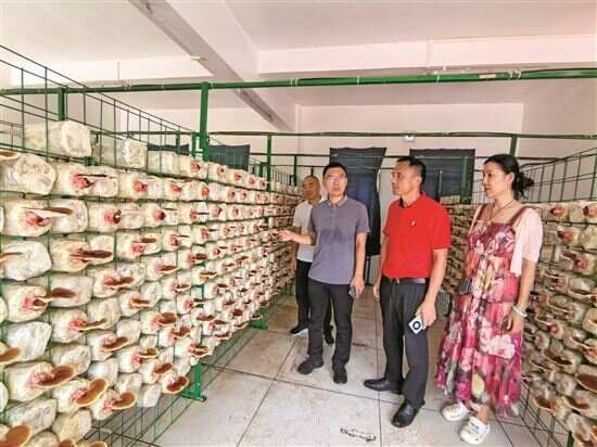 ■驻界炮镇工作队了解珍稀药食菌产业基地灵芝生长情况。 |