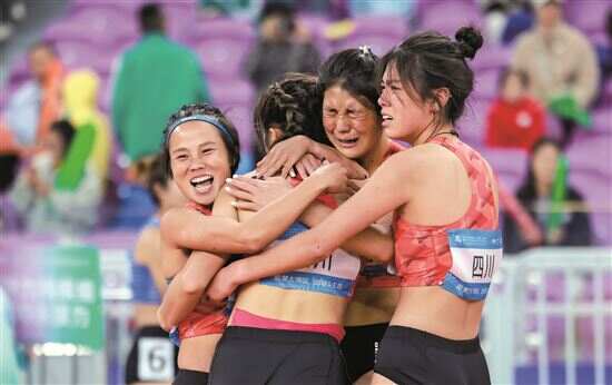 ■12月14日,残特奥会田径项目女子4×400米接力听障决赛比赛结束,四川队队员紧紧相拥。 |