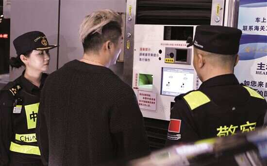■“粤车南下”入境香港市区的首位通关车主彭先生(中)在办理通关手续。新华社发 |