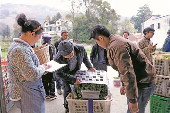 ■村民正在称重、打包豌豆尖。 |