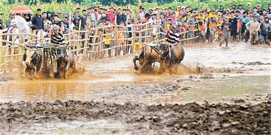 在印度尼西亚东爪哇省庞越,每年新的农耕季开始前或者庆祝丰收时,当地农民都会举行传统赛牛活动,吸引人们前来观看。新华社发