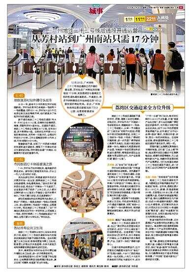 广州地铁二十二号线后通段开通运营 12月29日,广州地铁二十二号线后通段正式开通初期运营,芳村站至广州南站用时缩短至17分钟,实现荔湾区与番禺区之间的快速轨道交通联系。开通首日,很多市民特意前往车站体验这条160公里时速的南站快线。至此,广州地铁线网运营总里程达到779.9公里,运营里程稳居全国第三。 5∶40 地铁迷芳村站外蹲守头班车 29日一早,就有不少市民前往芳村站抢搭新线。芳村站此前早已有地铁一号线和十一号线覆盖,但昨日5∶40,芳村站F出口外已有多位轨交迷在等候开闸,他们都是为了体验芳村站的提速之旅。 新开通的地铁二十二号线后通段(陈头岗-芳村)全长11.5公里,自南向北设南浦西、南漖、西塱和芳村4座车站。后通段开通后,地铁二十二号线全长增至29.7公里,设车站8座,其中换乘站4座。这条定位为时速160公里的南站快线,采用单一交路方式,全程运行时间约27分钟,工作日高峰期安排13列车上线,行车间隔约4分50秒。 随着新线开通,实现了广州西部与南部的快速轨道交通联系,增强了广州南站的综合交通枢纽功能,同时承担连通广州南站、白鹅潭两大枢纽的重要作用。 7∶45 市民组团打卡体验提速之旅 7∶45,芳村站开始热闹起来,越来越多的乘客进站。新快报记者碰到吴先生、乔女士一行八人的市民打卡团。 吴先生家住芳村,特意邀请多年的好友齐聚芳村站一起出发,搭乘地铁二十二号线去畅游番禺,体验番禺美食。“退休后我们喜欢到处去逛,现在去广州南站一下子就到了,去坐高铁方便了很多!”上车之后,众人都对这辆时速160公里的8节编组D型列车赞不绝口。“列车又靓又舒适,而且速度够快!” 家住花地湾站附近的乘客李先生表示,之前去广州南站,一般是坐地铁一号线从花地湾上车,到公园前转二号线到广州南站,全程要50分钟。现在地铁二十二号线通了,“去广州南站比原来足足节约一半的时间,从花地湾上一号线,到芳村换乘二十二号线就能直达广州南站,全程只要25分钟左右。”李先生说。 服务 各站均有公共卫生间 地铁二十二号线陈头岗中心站站长林洁芬介绍,地铁二十二号线后通段车站内的服务设施延续近年新开线路的标准。各站均配置了公共卫生间、标准母婴室与第三卫生间,配备婴儿护理台及休息座椅,为亲子家庭及有特殊需要的乘客提供私密的空间。 其中,南浦西站与芳村站在非付费区额外增配公共卫生间,进一步方便乘客使用。 各站智能客服中心还专门设置了低位服务台,让有需要的乘客也能便捷办理业务,真正实现“无障碍、有温度”的出行体验。 荔湾区交通迎来全方位升级 地铁二十二号线后通段新开通的芳村、西塱、南漖三站定位清晰、功能互补,芳村站作为广州地铁一号线首批站点,随着地铁十一号线、二十二号线接入,从单一节点蝶变成“三线交会”的现代化枢纽;西塱站升级为四线换乘枢纽,实现二十二号线与一号线、十号线、广佛线的无缝衔接,进一步巩固广佛同城核心换乘节点地位,加速大湾区城际通勤一体化;南漖站扎根荔湾省级产业园,与地铁十号线花围站形成轨道交通网络,精准服务园区企业通勤与周边居民出行,为产业发展打通“最后一公里”。 芳村站:从“老站”到“交通心脏” 芳村站的发展变迁是广州轨道交通发展的生动缩影。依托最新开通的地铁二十二号线后通段,这座“老牌站点”实现多重升级。时速160公里的市域快线用速度赋能,向南17分钟直达广州南站,接入全国高铁网络;未来通过在建的芳白城际衔接白云机场,构建“高铁+航空”的空铁联运快速通道,打造大湾区南北向交通大动脉。 立体接驳,配套骨干市政道路、地面公交总站、非机动车停放区及人行通道无缝衔接,实现“地铁+公交+慢行”一体化换乘体系,彻底破解短途接驳痛点,满足不同出行场景需求。 西塱站:撑起广佛品质新主场 地铁二十二号线后通段的开通,也让广佛交界处的西塱实现历史性跃迁,成为广州中心城区首个四线换乘枢纽。这座承载广州地铁始发站记忆的节点,如今串联起广州南站,从交通要地升级为集消费、产业、文旅于一体的广佛都市新核心。 交通升级带动消费迭代,位于西塱的江楠荔塱市场作为“食在广州”的烟火地标,十余个门类的商品满足一站式采购,人均几十元的平民美食吸引网红与游客打卡,成为“广州一日游”热门站点;毗邻的江楠中心以4.8万㎡体量,打造“垂直产业生态链”,多元业态构建广佛枢纽经济新标杆,市井烟火与现代商业在此共生;始于1965年的西塱观赏鱼养殖产业,近年通过“合作社+品牌+服务”模式,拓展为科普、研学、观光一体的休闲渔业。这些商业设施,都有望搭乘地铁二十二号线后通段开通的东风,再旺一把。 西塱村镇工业集聚区聚焦激光与增材制造,正打造“工业上楼”样板;海龙围科创区白鹤沙片区集聚唯品会、绿瘦科技园等载体,引入战略性新兴产业,构建协同发展的现代产业集聚区,它们也有望在地铁二十二号线后通段开通后,进一步实现工业记忆向现代产业高地的跨越。 轨道+路网:“双轮驱动”协同完善 地铁二十二号线后通段的开通,与荔湾区近年路网建设形成“双轮驱动”格局。近年来,荔湾区累计投入120亿元,新建、改造道路超300条,总里程达200余公里:打通白鹅潭大道、花地河东侧道路等区域干道,强化白鹅潭商务区内外联动;完成159条道路环境提升,