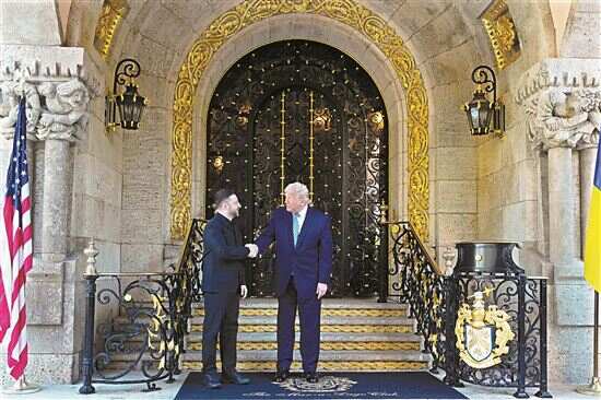 ■12月28日下午,美国总统特朗普在美国佛罗里达州海湖庄园同乌克兰总统泽连斯基举行会晤。这是特朗普在海湖庄园门口迎接泽连斯基。新华社/美联 |