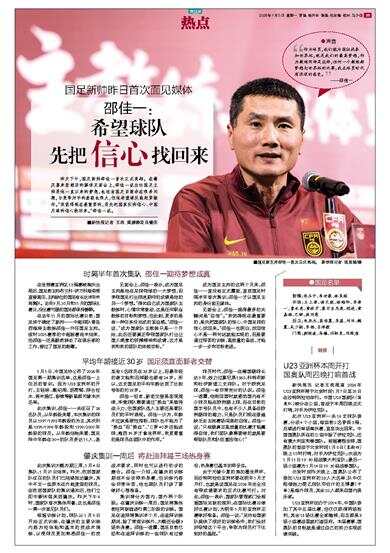 国足新帅昨日首次面见媒体 昨天下午,国足新帅邵佳一首次正式亮相。在肇庆喜来登酒店的媒体见面会上,邵佳一说出任国足主帅是他一直以来的梦想,也坦言国足目前存在很多问题,与竞争对手的差距也很大,