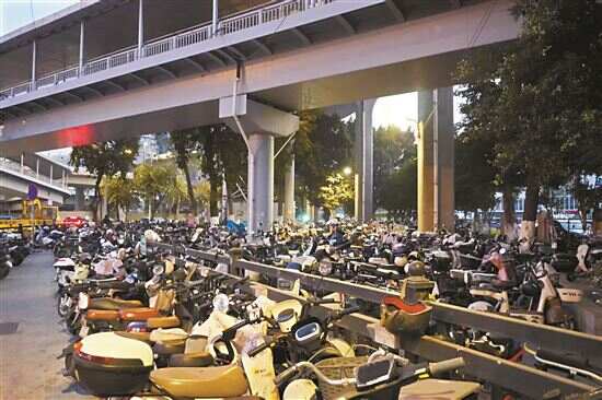 ■滘口地铁站附近,一些电动自行车因免费停车场内没有位置可停,而停在人行道上。 |