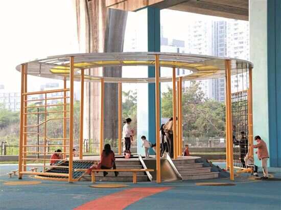 ■桥底变身色彩斑斓的游乐场,孩子们在家长陪伴下嬉戏。 |