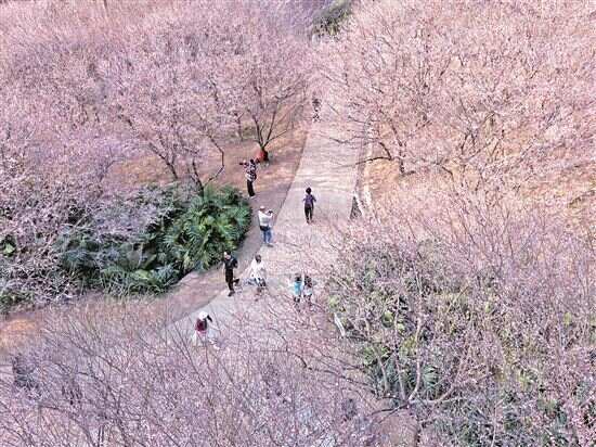 近日,广州白云山梅花谷的800余株梅树竞相绽放,有的白如瑞雪,有的粉似朝霞,吸引众多游客和市民前来欣赏。