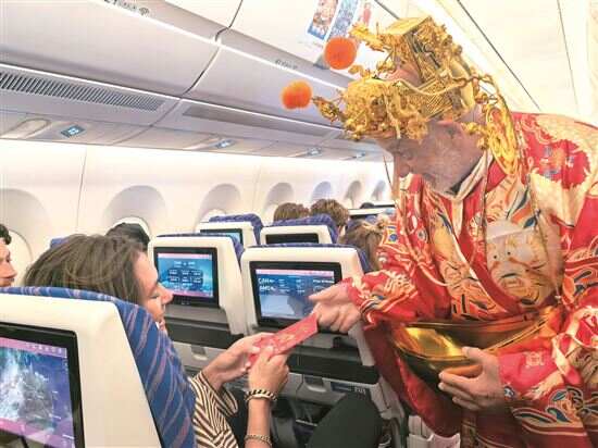 ■外籍旅客身穿“财神爷”服装,在万米高空向旅客发红包。 |