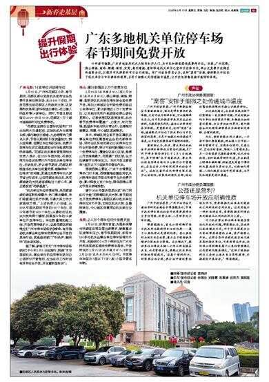 提升假期出行体验 今年春节假期,广东多地政府机关大院将打开大门,为市民和游客提供免费停车位。目前,广州花都,佛山禅城、南海、顺德、高明,东莞,惠州惠城、惠阳等地机关单位已宣布开放停车位,部分还免费开放辖区的道路泊位,以提升市民游客的节日出行体验。有广州政协委员认为,这种“宠客”安排,潜移默化中拉近了机关单位与市民游客的距离,正是于细微之处传递城市温度,以开放包容彰显城市温情的体现。 广州花都:14家单位开放停车位 2月10日,广州市花都区公布,春节期间,花都区部分党政机关面向社会免费开放单位停车场,共计600个泊位,开放范围包括花都区人民政府大院、区发展和改革局、新华街道办事处、花山镇人民政府等14家单位。同时,节假日期间每日20:00-次日10:00,花都区1万个城市道路临时泊位免费停放。 “花都区坐拥白云国际机场和广州北站两大交通枢纽,正加快成为北部增长极,辖内融创文旅城、九龙湖等热门景点众多,节假日期间吸引客流量较大,群众逛商圈、逛景区车位特别紧张,免费开放停车位切实提高游客出行体验感和居民幸福感。”花都区机关事务管理局相关负责人表示,自2025年国庆起,花都区便开始尝试免费对外开放机关单位停车位,反映良好,所以春节期间,花都区积极盘活机关单位闲置资源,缓解停车“一位难求”的问题,更通过免费停车为大家节省出行成本,让回花都走亲访友、来花都旅游的市民游客都能过个舒心年,真正感受到“花都温度”。 “机关单位车位毕竟有限,来花都旅游的游客数持续攀升,热门景点爆满,我们希望通过多方协调,尽最大努力为大家提供方便。”上述负责人介绍道,从2025年国庆期间开放的190个车位,到今年春节的600个车位;从最初的区机关大院和两个镇街,拓展至今年的14家单位开放停车位。车位数量增加超三倍,开放范围持续扩大,这是花都区积极响应《广州市停车场条例》精神、有序推动机关事业单位停车资源向社会开放的具体行动,更是政府部门“听民声、解民忧”的生动实践。 据了解,新修订的《广州市停车场条例》已于今年2月1日起施行,明确“本市国家机关、事业单位的自用停车场与办公场所分开管理的,应当在非工作时间有序向社会开放,并设置明显标识”。 佛山:累计新增近2万个免费车位 2月15日(农历腊月廿八)至2月23日(农历正月初七),佛山禅城、南海、顺德、高明多区机关单位停车场全面免费开放,再加上禅城区全时段免费的路边公共停车位,累计新增近2万个免费车位,让本地市民和外地游客在佛山游玩更顺心。记者梳理四区政策发现,此次春节免费停车覆盖广、力度大、针对性强,既服务本地市民日常出行,也精准对接景区、商圈、中心城区客流需求。 其中,禅城区将全面开放区属机关事业单位和区属国有企业的内部停车场,同时全区所有的路边公共停车位实行全时段免费,预计可临时新增超15000个免费停车位,覆盖全区核心区域,是佛山开放规模最大、范围最广的区域,全方位缓解节日停车压力。本次开放主要面向7座及以下小型家用非营运汽车。 围绕西樵山景区、广东千古情景区等热门打卡地,西樵镇推动镇政府机关大院停车场在节假日和春节全天免费开放,累计释放上百个车位,降低西樵山周边节假日拥堵指数。 曾于2025年国庆假期火成“热门网红打卡地”的顺德区机关大院,春节期间也开放免费停车;高明区部分机关单位停车位对外开放,实现区机关大院、各镇街单位、中心城区商圈周边机关单位全覆盖。 东莞:2.4万个停车位对外免费开放 2月10日,东莞市官宣,为服务保障市民游客在莞自驾出游需求,缓解重点区域停车压力,春节假期期间,东莞市130多处机关企事业单位停车场将对外开放,共提供约2.4万个停车位为广大市民和来莞游客提供免费停车服务,开放时间为2月15日(农历腊月廿八)8时至2月23日(农历正月初七)20时。开放停车车型为7座以下(含7座)小型非营运车辆。 声音 广州市政协常委黄丽丽: “宠客”安排于细微之处传递城市温度 广州市政协常委、广州市新联会副会长黄丽丽指出,假日是停车需求的高峰期,及时开放内部停车场,可以缓解停车压力,为市民和游客带来实实在在的便利,无疑是便民利民、盘活公共资源的务实举措。更重要的是,这种“宠客”安排,潜移默化中拉近了机关单位与市民游客的距离,正是于细微之处传递城市温度,以开放包容彰显城市温情的体现。 黄丽丽认为,机关、事业单位向社会开放停车场将成为常态化措施。《广州市停车场条例》已于2月1日起施行,其中明确“本市国家机关、事业单位的自用停车场与办公场所分开管理的,应当在非工作时间有序向社会开放”。这标志着开放内部停车场正逐步从临时性、政策性的便民安排,转向依靠法规保障的长期公共服务供给。 不过她也指出,在具体实施过程中仍需解决一系列操作问题:开放时段如何与单位安保需求平衡、车辆进出如何登记管理、安全责任如何界定、意外损伤如何处理等都需要在实施前制定清晰、合理的规则。 为此,黄丽丽提出两点建议,一方面可强化智慧赋能,例如接入全市统一停车管理平台,实现车位预约、无感支付、空位实时查询,降低人工管理成本;另一方面需要完善配套保障,优化车位标线、安防设施等硬件改造,并在制度上明确车辆剐蹭、财物遗失等意外事件的