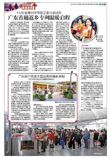 1126名贵州毕节务工者回家过年 新快报讯 记者麦婉诗 通讯员粤仁宣报道 随着马年春节脚步渐近,千万在粤务工人员陆续踏上返乡团圆之路。2月12日,腊月廿五,广州南站年味正浓。2026年“南