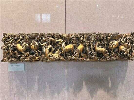 ■金漆木雕松林八骏图梁架下花楣。 |