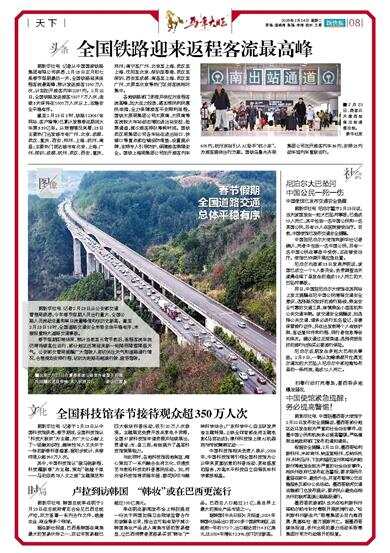 据新华社电 记者从中国国家铁路集团有限公司获悉,2月23日正月初七是春节假期最后一天,全国铁路迎来返程客流最高峰,预计发送旅客1850万人次,计划加开旅客列车2297列。2月22日,全国铁路发送