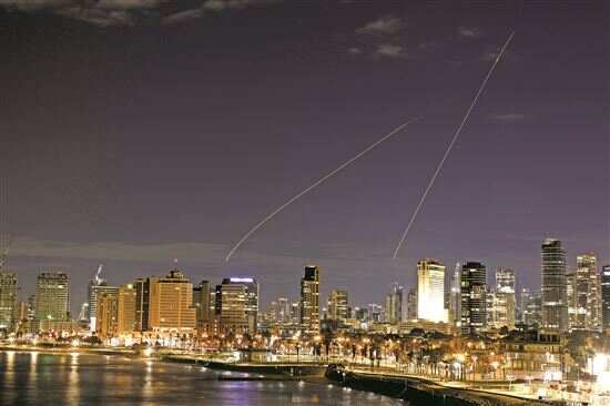 ■3月1日,在以色列特拉维夫上空,以军防空系统发射拦截弹后留下光轨。新华社发 |