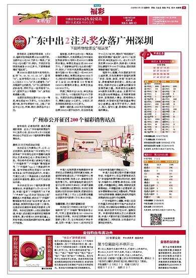 广东中出2注头奖分落广州深圳