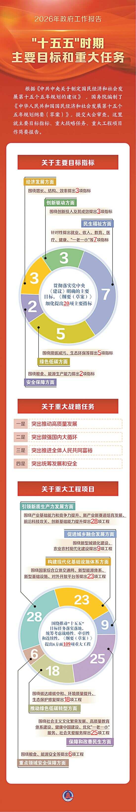 李强在政府工作报告中介绍“十五五”时期主要目标指标、重大战略任务、重大工程项目 据新华社电 国务院总理李强5日在政府工作报告中介绍,根据《中共中央关于制定国民经济和社会发展第十五个五年规划的建议》,国务院编制了《中华人民共和国国民经济和社会发展第十五个五年规划纲要(草案)》,提交大会审查。这里就主要目标指标、重大战略任务、重大工程项目作简要报告。 (一)关于主要目标指标 贯彻落实党中央《建议》明确的主要目标,《纲要(草案)》细化提出20项主要指标。经济发展方面,围绕增长、结构、效率提出3项指标。其中,综合考虑国内外形势和各方面因素,兼顾需要与可能,提出国内生产总值增长保持在合理区间、各年度视情提出,为到2035年人均国内生产总值比2020年翻一番、达到中等发达国家水平打好基础。创新驱动方面,围绕创新投入及其成效提出3项指标。其中,充分考虑研发投入增长趋势和企业投入能力,提出全社会研发经费投入年均增长7%以上,与“十四五”规划目标保持一致,确保研发投入力度不减。民生福祉方面,为更好解决人民群众急难愁盼问题,针对性提出就业、收入、教育、医疗、健康、“一老一小”等7项指标。绿色低碳方面,围绕降碳减污、生态环保等提出5项指标。其中,根据国家自主贡献目标,提出单位国内生产总值二氧化碳排放累计降低17%,继续推动重点领域绿色低碳转型。安全保障方面,围绕粮食、能源生产能力提出2项指标,着力夯实国家安全重要基础保障。 (二)关于重大战略任务 《纲要(草案)》分领域阐述了“十五五”发展的重大战略任务,突出体现四个方面。 一是突出推动高质量发展。发展新质生产力是高质量发展的内在要求。《纲要(草案)》强调科技创新的引领作用,着眼巩固壮大实体经济根基,构建以先进制造业为骨干的现代化产业体系。着眼高水平科技自立自强,加强原始创新和关键核心技术攻关,深入推进数字中国建设,数字经济核心产业增加值占国内生产总值比重达到12.5%。着眼建设美丽中国,持续深入推进污染防治攻坚和生态系统优化,加快形成绿色生产生活方式,确保碳达峰目标如期实现。 二是突出做强国内大循环。在外部环境复杂严峻的情况下,必须坚持扩大内需这个战略基点。《纲要(草案)》着眼增强国内大循环内生动力和可靠性,坚持惠民生和促消费、投资于物和投资于人紧密结合,大力提振消费,促进居民消费率明显提高,扩大有效投资。着眼充分释放我国超大规模市场红利,纵深推进全国统一大市场建设,破除地方保护和市场分割。着眼增强高质量发展动力,充分激发各类经营主体活力,加快完善要素市场化配置体制机制。着眼畅通国内国际双循环,统筹用好全球要素和市场资源。 三是突出推进全体人民共同富裕。中国式现代化是全体人民共同富裕的现代化。《纲要(草案)》着眼建设生育友好型社会,健全人口服务体系;办好人民满意的教育,劳动年龄人口平均受教育年限提高到11.7年;加快建设健康中国和体育强国,人均预期寿命提高到80岁;积极应对人口老龄化,养老机构护理型床位占比提高到73%;促进高质量充分就业,完善收入分配制度,健全社会保障体系。着眼缩小区域差距和城乡差别,加快农业农村现代化,持续巩固拓展脱贫攻坚成果,优化重大生产力布局,深入推进以人为本的新型城镇化。着眼促进人民精神生活共同富裕,弘扬和践行社会主义核心价值观,大力繁荣文化事业,加快发展文化产业,提升中华文明传播力影响力。 四是突出统筹发展和安全。安全是发展的前提,发展是安全的保障。《纲要(草案)》贯彻总体国家安全观,着眼推进国家安全体系和能力现代化提出多项任务举措。增强粮食、能源资源等供给保障能力,粮食综合生产能力达到1.45万亿斤左右,能源综合生产能力达到58亿吨标准煤。统筹推进房地产、地方政府债务、地方中小金融机构等风险有序化解。提高公共安全治理水平,有效维护社会安全稳定。 (三)关于重大工程项目 围绕推动“十五五”目标任务落实落地,统筹考虑战略性、牵引性和连续性,《纲要(草案)》提出6方面109项重大工程。引领新质生产力发展方面,围绕产业基础能力和竞争力提升、新产业新赛道培育发展、前沿科技攻关、创新基础能力提升提出28项工程。构建现代化基础设施体系方面,围绕国家综合立体交通网、新型能源体系、新型基础设施、对外开放平台等提出23项工程。促进城乡融合发展方面,围绕新型城镇化建设、农业农村现代化建设提出9项工程。保障和改善民生方面,围绕社会主义文化繁荣发展、高质量教育体系建设、健康中国建设、优化“一老一小”服务、社会关爱服务提出25项工程。推动绿色低碳转型方面,围绕碳达峰碳中和、环境质量提升、生态保护修复提出18项工程。重点领域安全保障方面,围绕粮食、能源安全等提出6项工程。这些重大工程兼顾当前和长远,既涉及“硬投资”也包含“软建设”。我们将注重以政府投资带动社会力量参与,更好发挥重大工程项目强基础、补短板、增后劲等重要作用。 展望未来,我们充满信心。在以习近平同志为核心的党中央坚强领导下,全国上下团结奋斗,一定能够把“十五五”宏伟蓝图变成美好现实。