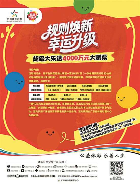 新快报讯 记者陆妍思报道 目前超级大乐透4000万元大赠票活动正在进行中。本次活动时间为2026年3月5日-4月11日,若上述时间内累计应赠票金额达到4000万元,则活动在金额达到的当日23:59:59结束。 活动时间内,购彩者购买超级大乐透一票10注彩票(一张单期票面打印10注单式号码的超级大乐透彩票)、指定复式投注或套餐票,即可获得对应超级大乐透赠票奖励。 赠票活动具体方法如下:购买18元套餐票/一票10注,单票赠票奖励4元(机选2注);购买28元套餐票,单票赠票奖励6元(机选3注);购买58元套餐票,单票赠票奖励12元(机选6注);购买88元套餐票,单票赠票奖励20元(机选10注);购买“6+3”复式票,单票赠票奖励8元(机选4注);购买“7+2”复式票,单票赠票奖励10元(机选5注);购买“6+4”复式票,单票赠票奖励16元(机选8注)。