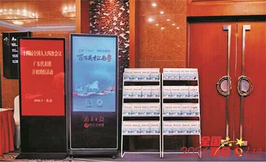3月6日下午,十四届全国人大四次会议广东代表团开放团组会议外,“百万英才汇南粤”招才手册摆放整齐。(人民网) |