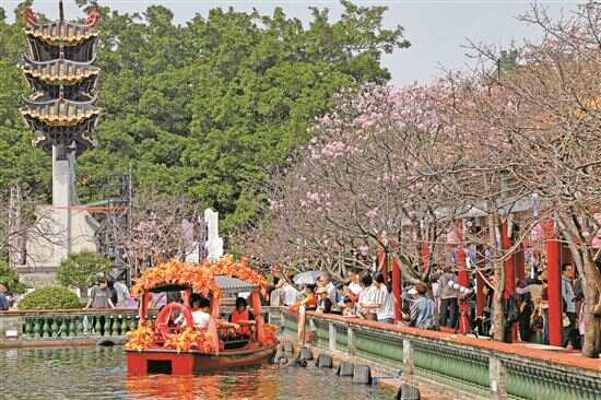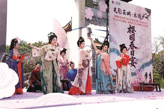 三月中旬最佳赏花季等你来 新快报讯 记者谢源源 通讯员冯晓敏报道 春日游,宝墨樱姿俏枝头。3月8日,“光影花城・乐游广州”跟着影视去旅行系列文旅促消费活动启动仪式暨2026年宝墨园・南粤苑汉风古韵樱花节开幕式在宝墨园举行,活动融合汉风古韵的雅致、樱雪漫舞的浪漫与影视IP的趣味,正式拉开宝墨园春日赏樱的唯美序幕。 双园联动 打造岭南园林赏樱美学 宝墨园广植广州樱、中国红两大本土自主培育品种,中国红花期较早,已率先绽放,阳春三月,广州樱浪漫登场,三月中旬将迎来最佳赏花季,花期持续至4月上旬。 宝墨园与南粤苑双园联动,构建“湖光山色”立体赏樱格局,亭台楼阁间樱花点缀成趣,南粤苑粉紫交织的樱花道与山峦叠翠的樱海相映,打造出独树一帜的岭南园林赏樱美学。 当天,开幕式依托宝墨园亭台楼阁、曲水流觞的园林格局,打造沉浸式樱花飘雪实景舞台,将岭南园林的雅致与大唐汉风的浪漫完美融合。开场秀《盛唐樱时》、舞剧《踏雪寻樱》、情景剧《樱园春日宴》……现场特色节目让观众沉浸式感受大唐春日宴的温馨雅致。 产业联动 打造“樱花+踏雪+古风+影视” 特色体验 作为“光影花城・乐游广州”系列文旅促消费活动的开篇之作,本次开幕式还设置了丰富的产业联动环节,现场为深耕文旅与影视领域的广州文旅推荐官授证,正式开启“影视内容赋能+文旅消费促进”的全新合作模式。影视企业现场推介影视主题文旅内容,全方位为文旅消费提质增效,同步拉开影视与文旅融合促消费的全新序幕。 宝墨园携手国家对外文化贸易基地(广州)、腾讯视频打造影视文旅新玩法,以“樱花+踏雪+古风+影视”为核心打造特色体验,园区布设踏雪寻樱和大热门剧集主题打卡点,涵盖多部热门剧目,把影视热度转化为实景文旅体验;游客还能偶遇化身“古风春宴嘉宾”的NPC,与其互动、合影留念。据悉,3月14日-15日、21日-22日、28日-29日的每周六日,宝墨园将在紫气清晖牌坊前后开展沉浸式古风NPC互动,搭配人工飘雪营造的樱雪纷飞意境,让游客沉浸式徜徉于汉风古韵的樱花美景中。
