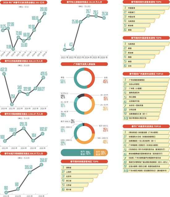 服务型消费、体验型消费占比提升至58.3% 首店、演出和珠江游船成春节消费“新三样” 马年经济消费的成绩单陆续公布,从“买商品”到“买体验”,从价格敏感转向价值认同,广州春节消费在2026年的新春完成一次高质量跃迁。其中,首店、演出、珠江游船成为拉动全城消费的“新三样”,共同构成广州消费升级的生动图景。众多的年轻人愿意为“第一次”“氛围感”“城市记忆”支付溢价,体验型消费成为这一轮广州消费升级的核心引擎,城市商业活力与文旅吸引力同步跃升。 从商品消费转向体验消费,增量来自“情绪价值”。数据显示,2026年春节广州服务型消费、体验型消费占比提升至58.3%,首次超过商品消费。首店、演出、游船均属于高情绪价值、高社交传播、高记忆点的体验场景。广州消费者对“首发、限定、独家、高品质”的接受度显著提升,愿意为优质体验支付溢价的人群占比达72%。首店的稀缺性、演出的现场感、珠江游的独特性,精准击中价值敏感型消费需求。 ■策划:新快报记者 罗韵 ■采写:新快报记者 罗韵 ■制图:廖木兴 首店 商圈流量新密码 契合新一代消费需求 首店经济,已成为衡量一座城市商业活力与消费吸引力的核心指标。相关资料显示,广州连续三年位居华南首店引进量第一,2025年全市新增各类首店327家,2026年开年首店落地速度进一步加快,春节假期成为集中亮相的黄金窗口。 首店不再是简单的“新店开业”,而是品牌首发、场景创新、城市审美的三重叠加。位于天河商圈的天环、太古汇、天河城以及番禺天河城、北京路步行街、万博商圈等成为了首店主战场,智能科技、潮玩生活、精致餐饮最受追捧。首店经济的爆发,印证广州正从“商贸之都”向国际消费中心城市稳步迈进。年轻消费者从“买到”转向“体验”,首店提供的稀缺性、仪式感与社交属性,精准契合新一代消费需求。 其中,天河路商圈2026年春节引进全国/华南/广州首店46家,涵盖潮流零售、轻奢美妆、智能科技、新式餐饮等赛道,带动商圈整体销售增长12.8%。北京路引进华南首店、广东首店19家,MINISO LAND华南首店、多家网红餐饮首店日均排队超300桌,带动步行街客流同比增长6.43%。 首店经济呈现三大趋势:科技品牌首店加速落地,科沃斯、影石Insta360、科大讯飞等智能科技品牌开设体验型首店;潮流与文化融合,艺术装置、限定联名、沉浸式空间成为标配;老城区首店焕新,永庆坊、沙面通过首店激活历史街区,2026年春节永庆坊接待游客125.43万人次,同比增长6.8%,沙面接待游客51.30万人次,同比增长8%。 演出 票房增长近三成 文娱消费迎来爆发期 2026年春节,广州演出市场全面爆发,剧场、音乐会、展览、非遗展演、烟花汇演、数字艺术体验轮番上演,成为继首店之后的第二大消费热点,标志广州从“美食之都”向演艺之都、文化之都升级,现场演出提供的情绪价值、社交价值、记忆价值,远超传统观光成为文旅消费的核心增量。 从剧场剧目到户外展演,从非遗传承到数字艺术,广州演出市场呈现全民化、年轻化、高品质特征。白鹅潭烟花汇演已成为城市超级IP;各类音乐会、话剧、音乐剧填补夜间消费空白;文博场馆推出的沉浸式体验,让文化消费更具黏性。演出经济不仅拉动票房,更带动餐饮、住宿、交通、零售等全链条消费,形成“观演+消费”的闭环生态。 数据显示,全市春节期间推出超2000场文旅活动,其中专业演出、剧场剧目、艺术展览超400场,较2025年同期增长23%。广州演出票房同比增长28.7%,观演人次增长26.3%,95后、00后占比超60%,成为观演主力。广州大剧院、星海音乐厅、广东省演艺中心春节假期场均上座率超92%,部分热门剧目一票难求,加场仍售罄。 白鹅潭烟花汇演线上预约观看超1200万人次,微博话题阅读量超2000万,带动周边餐饮、住宿、交通消费增长超30%。南越王博物院、广东省博物馆日均接待超8000人次,文博+演艺+数字体验成为家庭消费热选。