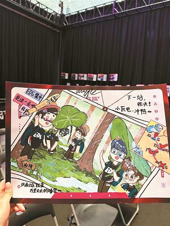 ■EDG粉丝将漫画作品画在了现场应援牌上,这张应援牌后来被挂在了赛后采访间。 |
