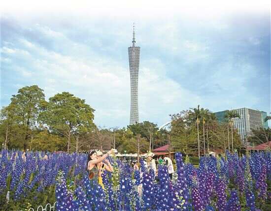 ■3月18日,广州天气晴好,二沙岛宏城公园被大飞燕草装点成蓝紫色海洋,吸引了众多游客前来打卡拍照。新快报记者 观显锋/摄
