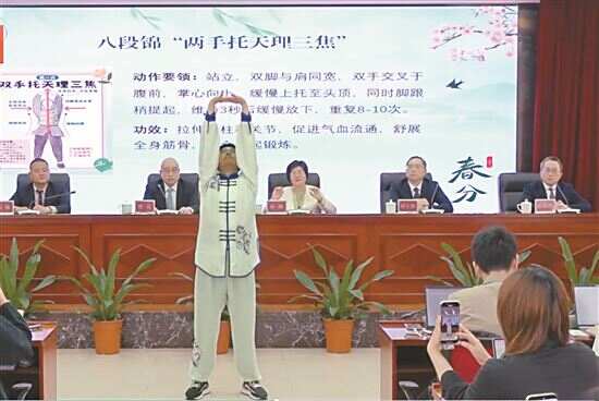 中医展示的八段锦“两手托天理三焦”能促进气血流通、舒展筋骨,推荐锻炼。 |