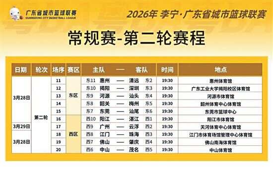 3月22日,2026广东省城市篮球联赛(粤BA)首轮展开了除揭幕战外余下比赛的角逐,九场比赛在九座城市同时打响,本轮赛事不仅对抗强、悬念足,集齐“绝杀球”“双加时”“逆转”等精彩戏码,城市文化氛围还特别浓厚,可谓“热辣滚烫”,为次轮的比赛奠定了激烈又好看的基调。 ■新快报记者 黄闻禹 多场对决战至最后时刻 从整体格局上,9场比赛中主场球队5胜4负,多场对决打到最后一节甚至是最后时刻才分出胜负,既展现出竞技水平,也彰显了城市风采。 聚焦赛事,夺冠热门东莞队客场挑战梅州队,上演“马东梅”戏码,以110比55大胜,轻松拿下赛季“开门红”。卫冕冠军河源队则稍显准备不足,客场不敌深圳队。潮州队与惠州队的比赛全场胶着,潮州队在最后时刻完成绝杀,以77比75惊险取胜,潮州主场瞬间沸腾,这也是粤BA开赛以来的首场压哨绝杀。汕头队在半场落后,凭借下半场的成功反击,最终主场6分逆转韶关队。 本轮比赛最有看点的一场对决,当数肇庆队客场挑战云浮队,粤BA首场“双加时”大战上演。两队在本场比赛中打得异常激烈,在常规时间结束前,肇庆队将比分追成89平,双方进入首个加时。加时赛中,双方依旧打得难解难分,双方各得11分战成100平,拖入第二个加时。最终,云浮队在比赛的最后一分钟内把比分拉开,以113比107捍卫了主场荣耀。 不少球队主打“年轻速度流” 从战术风格看,首轮球队普遍更重视防守与转换,快攻得分、抢断反击成为主流得分手段,阵地战更强调内线冲击与外线穿插。不少球队主打“年轻速度流”,用体能和冲击力拖垮对手,也有队伍坚持稳扎稳打,靠经验与严格的战术纪律取得胜利。 城市互动成为赛事风景 赛场之内是拼搏,赛场之外是温情。城市间的互动与友谊,成为本轮赛事动人的风景。东莞500名球迷远征梅州,高喊“制造精彩,进莞来战”,梅州精心准备了山歌等富有客家特色的文艺表演,展现淳朴热情的地域风情;江门与佛山中场互赠礼品,新会陈皮和陶瓷茶壶的礼物搭配,展现城市特色的同时,流露出烟火气;深圳与河源、茂名与湛江等球队,以特产、文创互通心意,生蚝、荔枝等成为城市友谊的信物;汕头则是“牛气冲天”,比赛尾声送出一头活牛大奖,点燃全场。 文明观赛、真诚致敬,看台观众也是一道文明的风景线。粤BA“梅莞”大战后,球迷自发打扫垃圾,留下一片整洁场地,把热爱留在赛场,把干净还给城市。 第二轮比赛周末开打 加上揭幕战,首轮战罢。东区的潮州、揭阳、深圳、汕头、东莞,西区的中山、珠海、云浮、湛江、佛山等十支球队取得胜利,汕尾队则在首轮轮空。 粤BA第二轮比赛将于本周末(3月28日—29日)开打,让我们一起期待接下来更精彩的比赛。 粤BA赛事预约购票系统自3月24日10:00正式开启!前往现场观赛的球迷朋友可以关注“广东篮球-粤BA”公众号,点击主页“粤BA购票”专栏,进入票务系统预约。