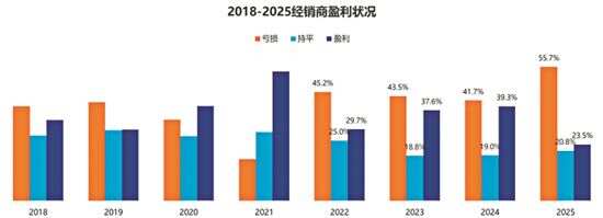 中国汽车流通协会发布报告 新快报讯 记者陈镟报道 2025年,中国汽车市场在政策暖风与终端寒流的交织中走过。尽管国家“两新”政策释放了消费需求,但处于流通末端的经销商却未能共享红利。 近日,中国汽车流通协会发布的《2025年全国汽车经销商生存状况调查报告》显示,2025年汽车经销商普遍未能完成全年销量目标,价格倒挂持续,新车业务亏损加剧,汽车经销商亏损面增加,盈利面收窄,经销商对主机厂满意度跌至历史冰点。 数据显示,2025年全年仅有44.3%的经销商完成年度销量目标,较2024年进一步下滑。品牌分化明显,豪华及合资品牌完成率超五成,而自主品牌因目标设定激进,实际完成度最低,成为拖累整体达标率的主因。 “卖得越多,亏得越狠”成为许多经销商的真实写照。受第四季度多地置换补贴告罄、需求萎缩等影响,新车业务亏损加剧。 调查显示,2025年经销商盈利比例从39.3%骤降至23.5%,亏损比例高达55.7%。在毛利构成中,新车销售毛利贡献率为-25.5%,持续为负且幅度扩大;售后服务以80.8%的贡献率成为生存“压舱石”;金融保险贡献率为24.3%,但由于商业银行消费金融产品的调整,金融保险的毛利贡献出现大幅度下滑。 值得注意的是,调查样本中,新能源汽车品牌的经销商或者代理商占比达到29.9%,较2024年的16.8%明显提升,并且新车销售表现出了相对较好的盈利能力,毛利占比达26.5%,实现正向盈利,与传统燃油车形成鲜明对比。 价格倒挂是吞噬利润的“头号杀手”。2025年81.9%的经销商存在价格倒挂,其中51.5%倒挂幅度超15%。叠加资金压力大、成本高、库存高企及客流下滑,生存空间被极度压缩。 高压之下,厂商关系趋紧,经销商对主机厂总体满意度得分仅60.8分,创历史新低。销量任务过高、价格倒挂、高库存、配件价虚高、强制搭售及同城网点过多导致的恶性竞争,被列为不满主因。 与此同时,从协会发布的《2025-2026年度中国汽车流通行业发展报告》(下称《报告》)也可以看到,汽车渠道网络层面发生了结构性变革加速。 截至2025年底,全国4S网络规模32432家,较上年收缩1.4%,缩幅收窄。中国汽车流通协会副秘书长郎学红表示,虽然4S网络整体规模收缩,但内部呈现结构性分化,传统燃油车4S网络继续收缩,而新能源4S网络则保持扩张态势。 具体来看,自主品牌4S网络逆势增长1.1%至21371家,占比升至66%;合资和豪华品牌网络分别减少5.7%和5.8%。全年新增近5000家4S店中,新能源品牌约占56%,自主品牌份额高达88%;退网近5000家中,自主品牌占76%,显示该板块激烈的“优胜劣汰”。此外,新能源独立渠道达26260家,同比增长约21.0%。代理与直营组成的直接销售模式规模占比首超传统的授权经销模式。 《报告》指出,2025年,汽车渠道从“规模化铺量”向“极效化运营”转型。厂家不再单纯追求店面数量的盲目扩张,而是尝试突破传统单一模式的限制,采取集团内并网、轻量化建店以及跨界融合,应对渠道稳定和经营承压的挑战。