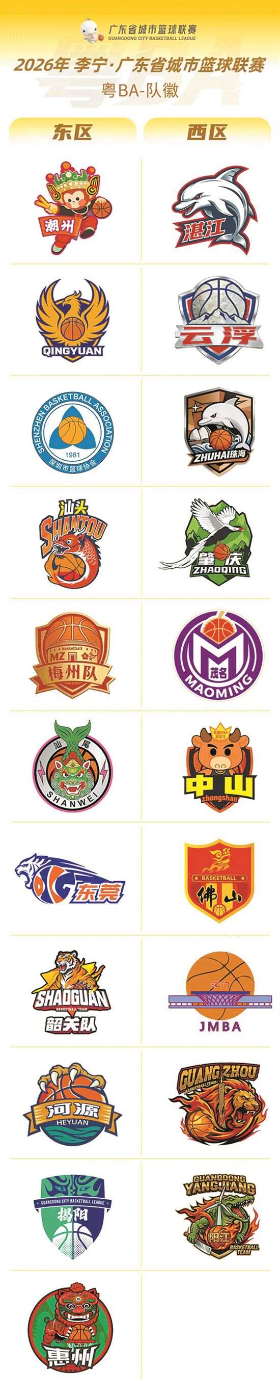 21地市粤BA队徽集体亮相 近日,21支广东省城市篮球联赛(粤BA)参赛队的队徽正式亮相。这些队徽设计各藏巧思,方寸之间尽显各地独特的在地文化。与职业赛事队徽不同,粤BA各队的队徽不仅承载着球队精神,更肩负着传播城市文化的使命,是对岭南文化地域特征的探索与创新实践。有的融入当地代表产业,如阳江的刀具、云浮的石材;有的以非物质文化遗产为主视觉,如揭阳的英歌舞、惠州的盖子狮;还有的巧妙吸纳城市地标元素或传统民居,如广州塔“小蛮腰”、梅州围龙屋。 21个队徽在设计上各藏巧思,整体来看可分为非遗民俗风、猛兽兵团风、产业风物风三大类。针对部分队徽出现的“撞脸”“撞元素”现象,专家解释称,部分地市共享相同的文化根源,此类现象实属正常。 ■新快报记者 程羽 非遗民俗风 非遗民俗风是指将岭南民俗融入队徽,最能体现地方根脉。 惠州队徽提炼惠州省级非遗项目盖子狮的形象,盖子狮跃起灌篮,颇有几分“盖世英雄,舍我其谁”的霸气。 汕尾队徽造型取自汕尾市城市文旅IP形象“汕尾狮”。该形象今年2月才在汕尾城市文旅品牌发布会上正式亮相,这会儿就派上用场了。 潮州队徽是一只左手打篮球、右手拿英歌槌的潮州“府楼猴”。府楼猴是明代潮州府署镇海楼栏杆上的木雕装饰,原共有108只,因“猴”谐音“侯”,寓意“封侯拜相”,寄托了对地方官员造福一方的期许。府楼猴于2024年正式被“委任”潮州古城文旅IP,出现在各景区打卡点和城市文创产品上。 近些年,揭阳最火的非遗就是英歌舞,多次亮相央视春晚并远赴多国交流。揭阳队徽提取英歌舞经典脸谱与篮球造型,极简却传神地彰显阳刚之气。 汕头队徽主元素也是来自传统文化的符号,是一条鳌鱼,象征 “勇立潮头、独占鳌头”。橙红渐变的鳌鱼缠绕着篮球,既呼应汕头海滨城市的身份,又暗含竞技场上的必胜信念。 佛山队的盾形队徽采用红、黄为主色调,上方的醒狮图案呼应佛山“醒狮之乡”非遗名片,下方苍劲有力的书法“佛山”二字同样具有传统气韵,盾牌底部巧妙嵌入一个篮球。整体视觉实现了辨识度高、文化底蕴深厚,有充满竞技霸气的效果。 猛兽兵团风 当21枚队徽一字排开时,“猛兽军团”格外醒目。霸气的狮子、威猛的老虎、凶悍的鳄鱼……一股满满的“战斗力”扑面而来。选择猛兽形象作为队徽主视觉,是因为运动赛事本身就是高强度对抗,猛兽形象自带“力量感”“威慑感”,能瞬间强化赛场气氛。除了猛兽天然代表“勇气”“力量”“竞争”之外,各地市选用的动物与城市文化也有所关联。 广州队徽采用怒吼的雄狮作为主视觉不难理解。狮子在岭南文化中本就与醒狮、武术深度绑定,契合篮球运动的对抗属性,也呼应广州作为千年商都的进取气质。 韶关队选用猛虎作为队徽主视觉,是因为当地是华南虎保护的核心阵地,辖区内的车八岭等保护区承担了生态修复、华南虎野化训练的重要任务。 东莞队徽上的也是华南虎,不过这只“虎”是为了致敬中国篮球的旗帜球队——广东宏远华南虎。 鳄鱼出现在阳江队徽里,其实也不奇怪,因为阳江古称鼍城。很多人都认为,“鼍”就是扬子鳄。队徽中,鳄鱼身旁的风车,象征着阳江作为“中国风电之都”的产业名片;它手中紧握的菜刀,则呼应了享誉全国的“十八子刀具”。三种元素叠加,既彰显了阳江的历史渊源,又凸显了当代的产业特色。 产业风物风 河源被称为“恐龙之乡”,拥有全国最丰富的恐龙蛋、骨骼及足迹化石。队徽上的巨大兽爪正呼应这一元素。 肇庆队徽以“省鸟”白鹇为核心。1988年,白鹇被正式评选为广东省省鸟。在肇庆鼎湖山国家级自然保护区,白鹇种群数量丰富,是肇庆的标志性物种。 湛江、珠海均以中华白海豚作为队徽主视觉,这与两座城市的海洋生态文明、宜居生态定位高度契合。不过,同样是白海豚,两座城市却给出了截然不同的视觉表达:湛江的是“赛场猛兽”,珠海的则是“城市精灵”。 清远队徽是一只在盾牌前展翅欲飞的鎏金凤凰,这是取自清远的别名“凤城”。 梅州队徽里藏满了客家印记,梅花、客家围屋等元素一目了然,整体金色调更添一份沉稳高级感。 云浮队则以银灰色调为主,直观诠释了“石都云浮”的石材产业与生态名片。 茂名队的设计更显巧思,将荔枝与篮球巧妙融合,精准呼应了“中国荔枝之乡”的城市标签。 在揭幕战上三分反超省会广州队的中山队,更是直接把“全国村BA冠军牛”印上队徽。这段威水史往场边一摆,光是气势就先赢了三分。 江门、深圳的队徽则是两市篮球协会沿用多年的旧标识,其中江门队正面向全网征集新设计。 专家解读 “撞元素”是文化共通的正常现象 广州岭南文化研究会会长、广东财经大学教授江冰认为,此次粤BA队徽设计是对岭南文化地域特征的主动寻找与创新实践。广东因移民历史形成四大文化板块,各地市文化根源既有差异又存共性,通过队徽提炼本土符号,是文化建设中“众里寻他千百度”的必要过程。文化特征常隐于日常,需反复挖掘、凸显,方能从“远看草青,近看无”中提炼出可感知的文化标识。 江冰认为,文化建设需依托“文化描述论”,即由文化人持续对资源进行描述、提炼与强化。因此队徽设计不仅是视觉工程,更需结合城市文化发展战略,综合考量意象选择、长期关联及记忆唤醒。针对21个队