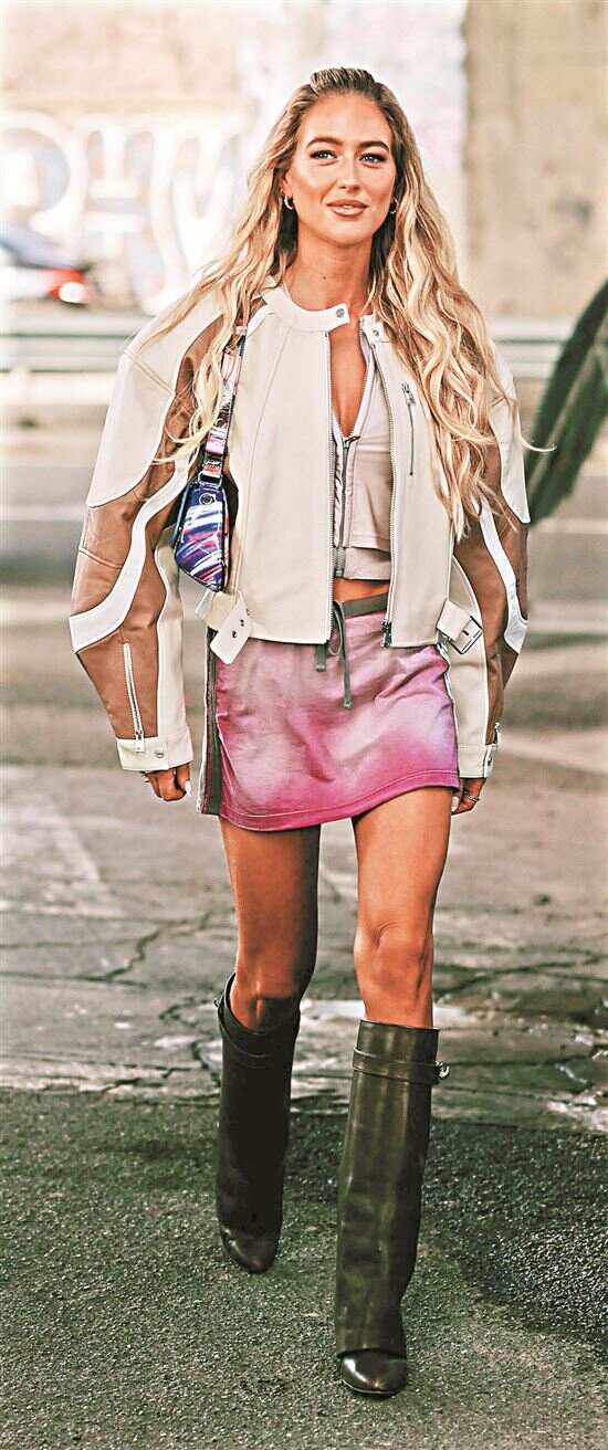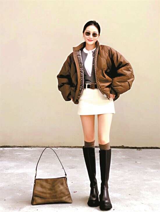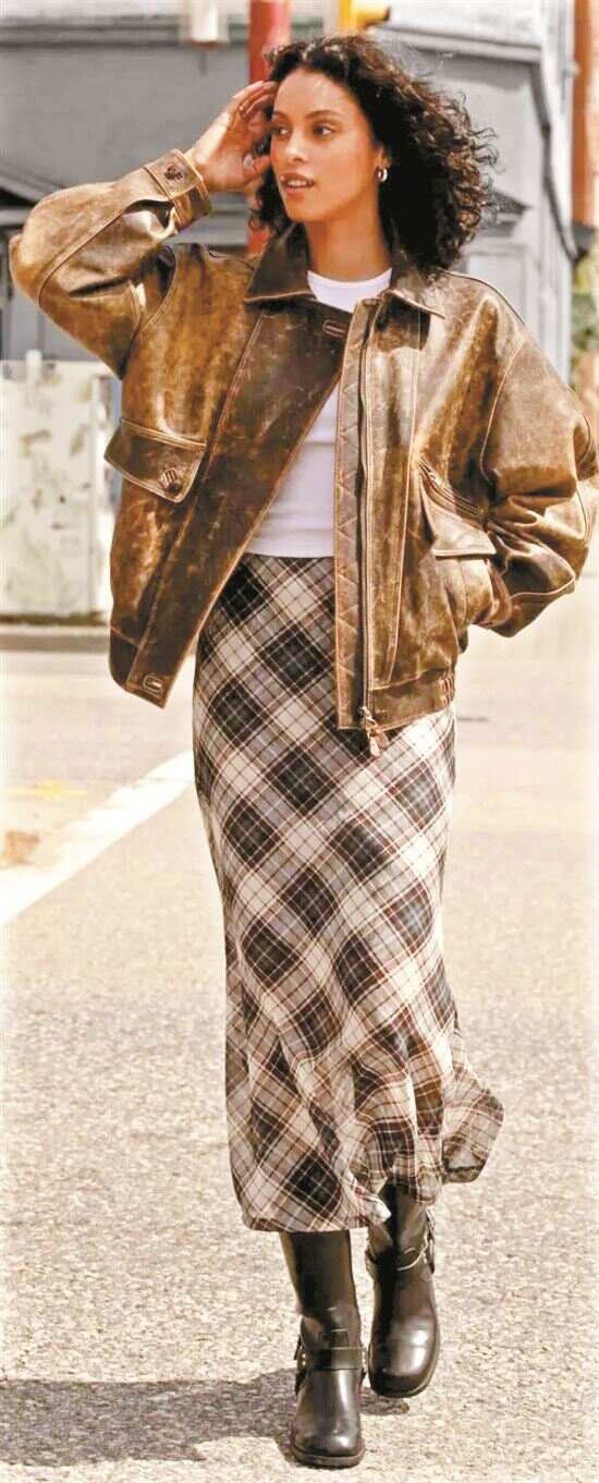 ▲短款皮夹克是包臀短裙的“气场搭档”,简约利落的版型与皮革长靴呼应,酷飒高级。 |