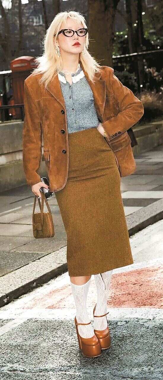 麂皮面料夹克为铅笔中裙注入复古温柔,选同色系裙装更显高级智感。 |